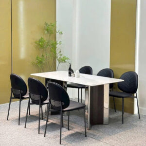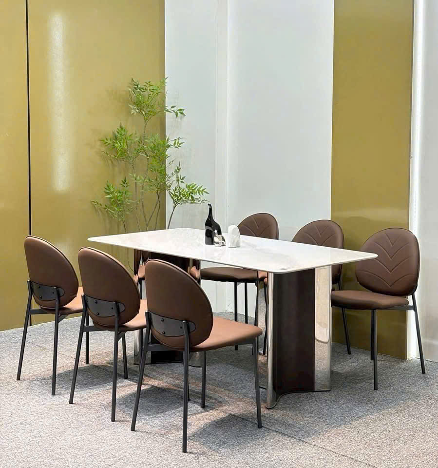 Bàn ăn mặt đá hình chữ nhật đi cùng 6 ghế da cafe nâu lưng cong chần mũi tên – thiết kế tối giản, dễ phối hợp nhiều không gian.
