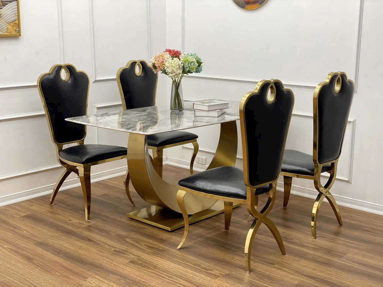 Bàn Ăn Mặt Đá Chân Mạ Vàng – Ghế Tân Cổ Điển Đen Vàng Đẳng Cấp Hoàng Gia