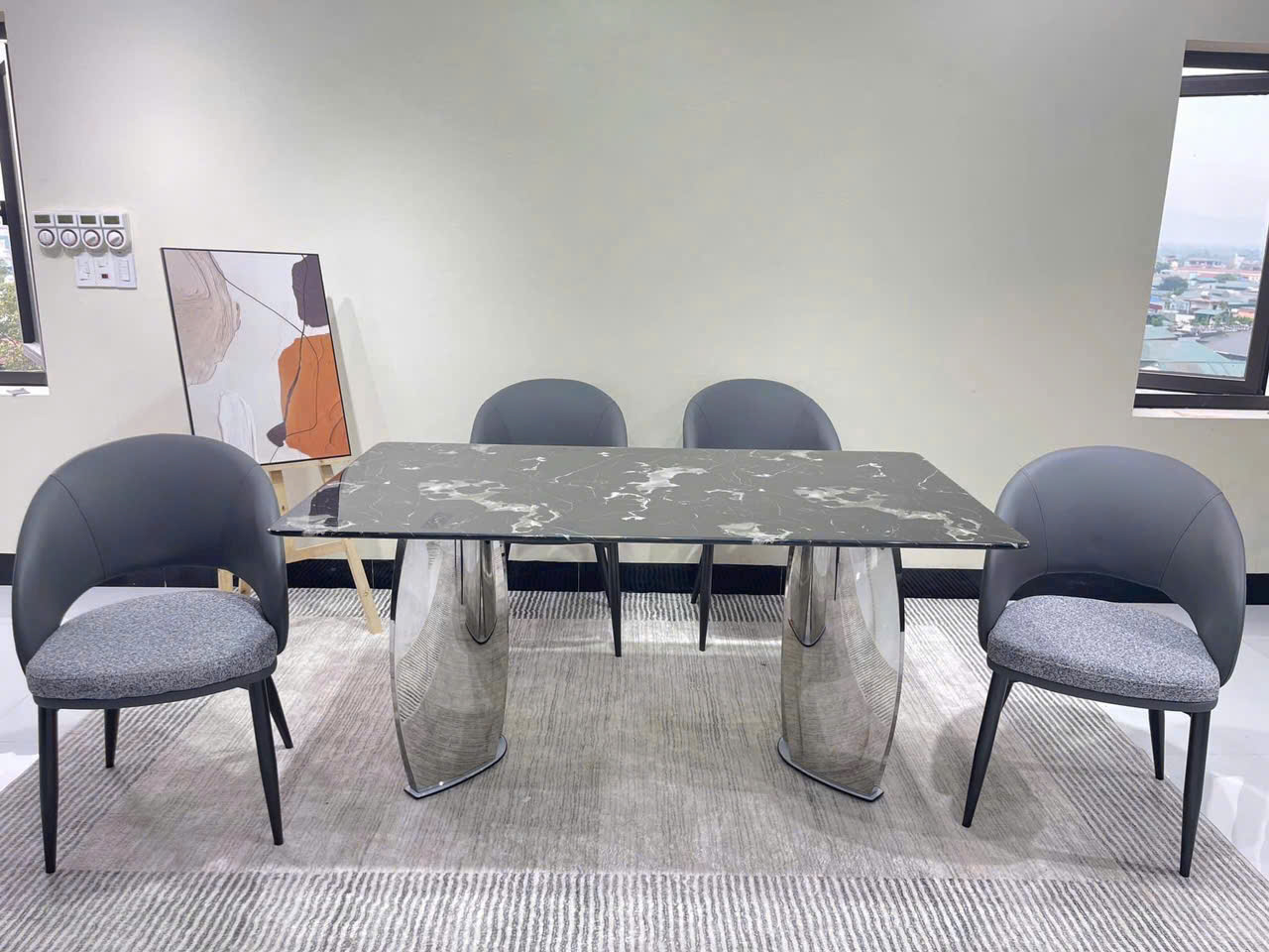 Bộ bàn ăn chữ nhật mặt đá đen vân mây được thiết kế theo phong cách minimalism (tối giản hiện đại), kết hợp chân bàn inox sáng bóng và 4 ghế cong bọc da nỉ êm ái. Sản phẩm là lựa chọn hoàn hảo cho các không gian sống hiện đại, căn hộ chung cư hoặc studio trẻ trung.