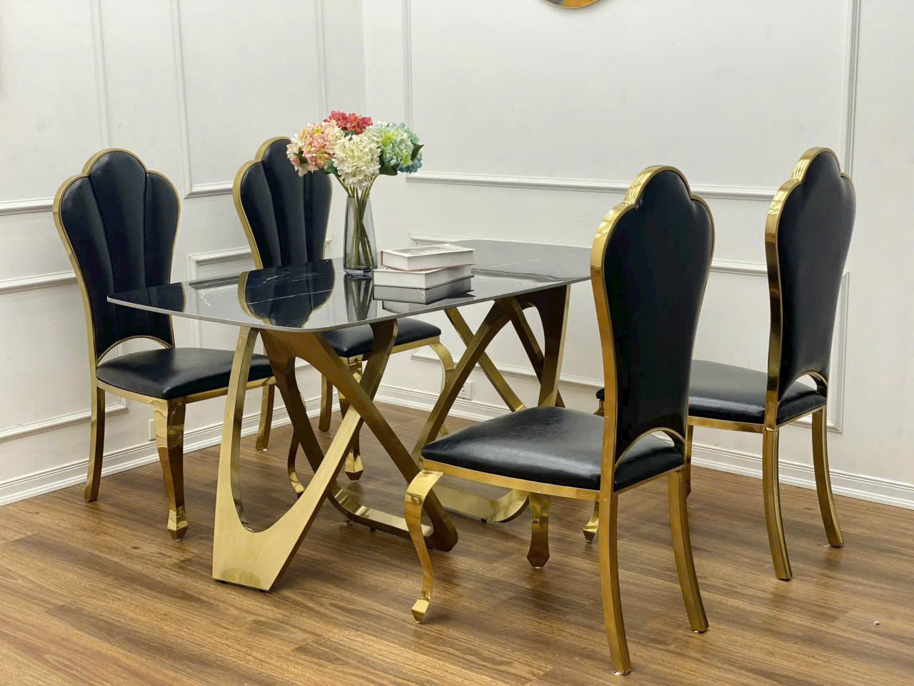 Bộ bàn ăn cao cấp mang phong cách tân cổ điển châu Âu, nổi bật với mặt bàn đá đen bóng sang trọng, kết hợp chân bàn inox mạ vàng uốn cong nghệ thuật, tạo nên vẻ đẹp vương giả và đẳng cấp. Ghế ăn bọc da đen viền vàng, thiết kế tựa lưng cao hình vương miện độc đáo, mang lại sự thoải mái và ấn tượng trong không gian nội thất.