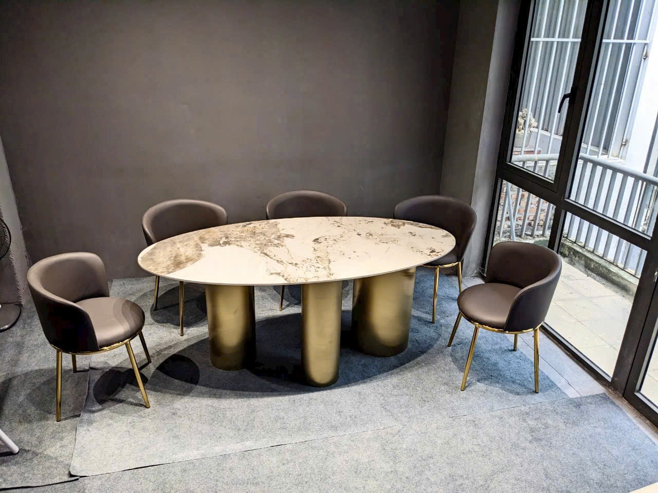 Bộ bàn ăn thiết kế theo phong cách châu Âu hiện đại, nổi bật với mặt bàn hình oval đá vân mây loang độc đáo, kết hợp với 3 chân trụ inox mạ vàng ánh kim sang trọng. Ghế ăn thiết kế lưng tựa tròn, đệm dày tạo cảm giác thoải mái khi ngồi lâu, phù hợp cho không gian căn hộ cao cấp, nhà phố sang trọng, biệt thự hoặc showroom tiếp khách.