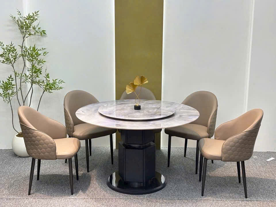 Bàn ăn tròn mặt đá xoay kết hợp cùng 4 ghế da lưng chần tổ ong – lựa chọn hoàn hảo cho không gian bếp hiện đại, sang trọng và tiết kiệm diện tích.