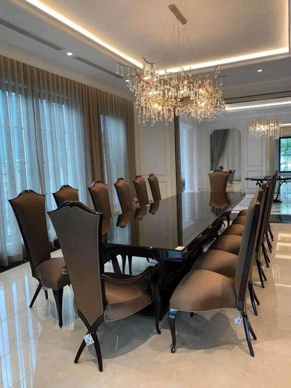 Tôn vinh vẻ đẹp hoàng gia và đẳng cấp thượng lưu, bộ bàn ăn 12 ghế phong cách cổ điển châu Âu là lựa chọn hoàn hảo cho biệt thự, lâu đài hoặc không gian tiếp khách cao cấp. Mặt bàn dài phủ kính đen bóng sang trọng, kết hợp với hệ ghế lưng cao thiết kế uốn lượn tinh xảo, mang đến cảm giác quyền quý và thanh lịch.