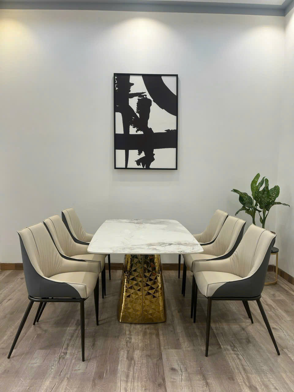 Bộ Bàn Ăn 6 Ghế Mặt Đá Trắng Chân Vàng Kim – Ghế Da Phối Kem Xám Hiện Đại, Sang Trọng