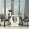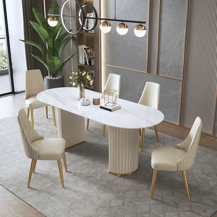 Mang phong cách châu Âu hiện đại, bộ bàn ăn 6 ghế thiết kế thanh lịch là lựa chọn lý tưởng cho những không gian sống cao cấp. Mặt bàn đá trắng vân mây tinh tế, kết hợp chân bàn đôi trụ đứng vân dọc nổi bật. Ghế ngồi màu kem phối chân vàng thời thượng, tạo nên tổng thể sang trọng, đẳng cấp cho phòng ăn.