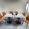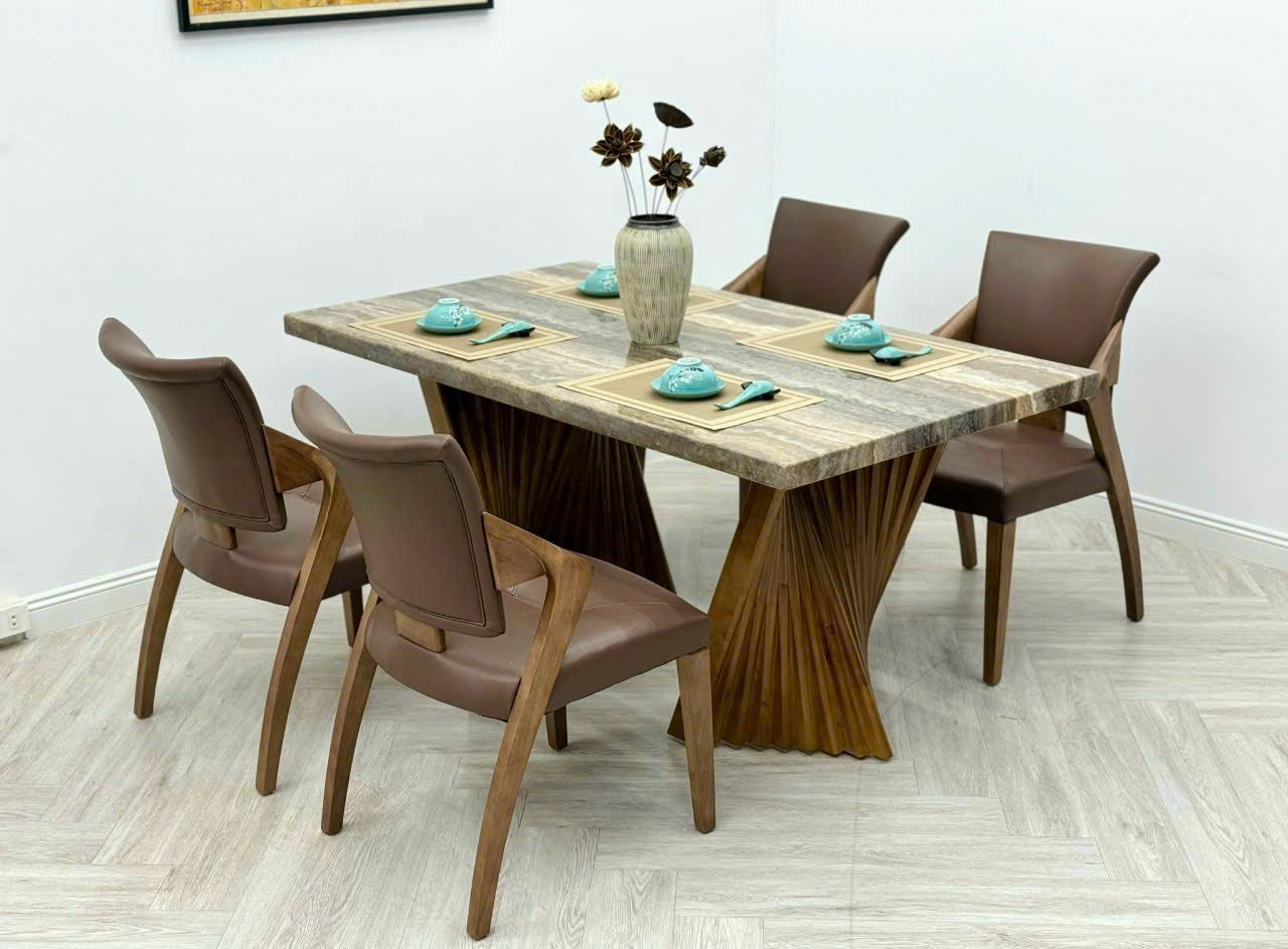 Mang đậm hơi thở Á Đông và phong cách tân cổ điển, mẫu bàn ăn gỗ mặt đá tự nhiên 4 ghế da nâu là lựa chọn lý tưởng cho những ai yêu thích không gian ấm cúng, tinh tế. Mặt bàn vân đá độc đáo kết hợp cùng phần chân bàn xòe chạm khắc dạng quạt tạo nên điểm nhấn khác biệt cho phòng ăn.