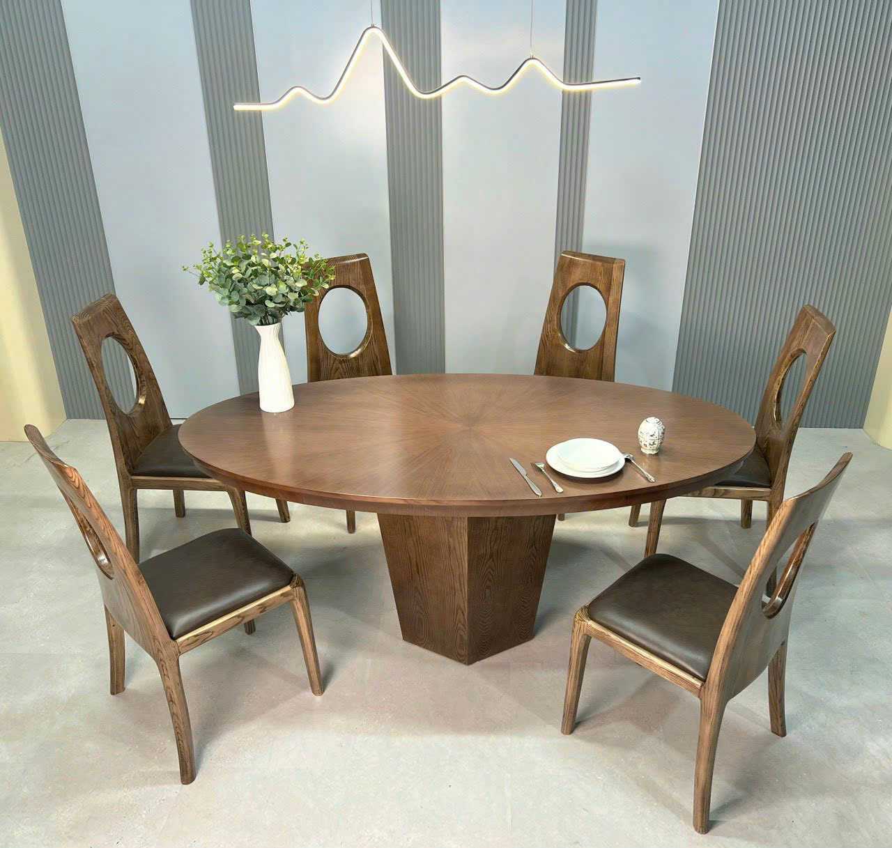 Mang đậm chất retro hiện đại, bộ bàn ăn gỗ mặt oval với 6 ghế tựa khoét tròn tạo điểm nhấn thẩm mỹ độc đáo. Màu nâu trầm của gỗ kết hợp đệm da sang trọng đem lại sự ấm cúng và thanh lịch cho không gian phòng ăn.