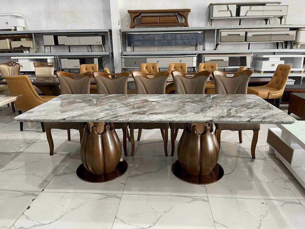 Tôn vinh không gian sống đẳng cấp với bộ bàn ăn mặt đá 10 ghế phong cách tân cổ điển. Thiết kế sang trọng với chân bàn hoa văn nghệ thuật, kết hợp ghế gỗ bọc da cao cấp, mang lại vẻ đẹp quý phái và hoàng gia cho biệt thự, nhà phố cao cấp hay phòng ăn rộng.