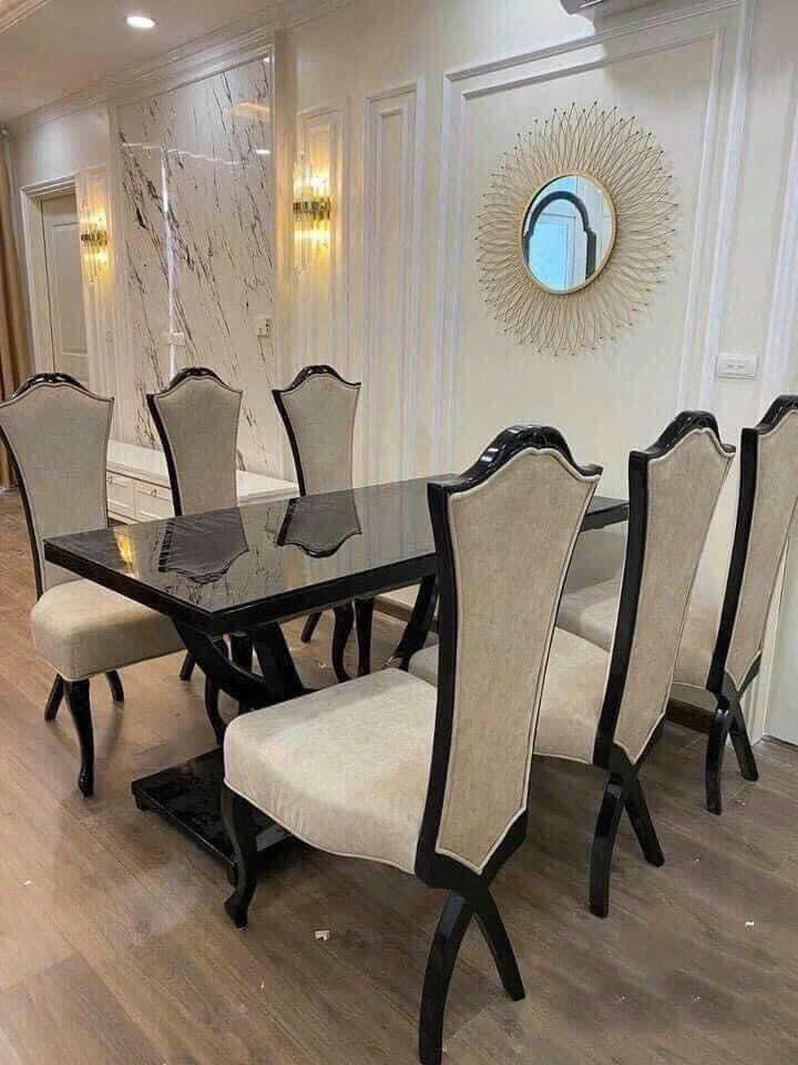 Tô điểm không gian sống đẳng cấp với bộ bàn ăn mặt đá đen 6 ghế thiết kế lưng cao bọc vải nhung sang trọng, viền gỗ đen sắc sảo. Mặt bàn đá đen bóng huyền bí, chống trầy xước và dễ lau chùi, kết hợp cùng chân bàn vát chữ V hiện đại, tạo điểm nhấn cá tính cho phòng ăn.