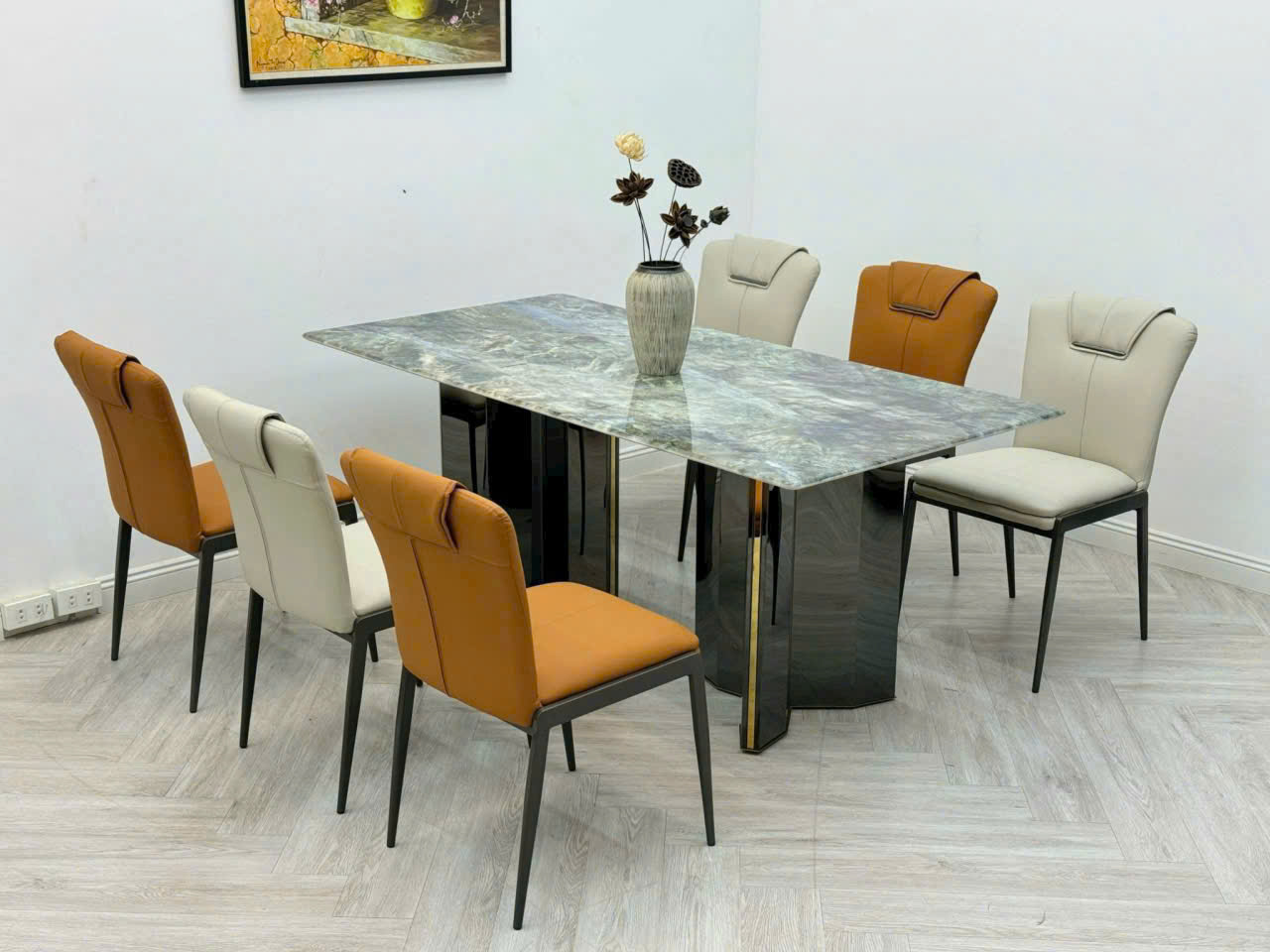 Mẫu bàn ăn hiện đại với mặt đá marble vân mây tinh xảo kết hợp chân bàn inox đen bóng mạnh mẽ, đi cùng bộ ghế phối màu cam – kem lạ mắt, tạo nên không gian ăn uống đẳng cấp và đầy cá tính.