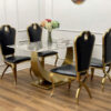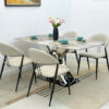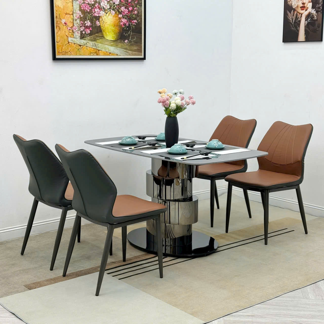 Mang phong cách hiện đại, bộ bàn ăn này nổi bật với mặt bàn đá trắng phối kính đen cường lực tinh tế, kết hợp chân trụ inox bóng sang trọng, tạo điểm nhấn mạnh mẽ cho không gian phòng ăn. Ghế ăn bọc da nâu đậm phối lưng đen đầy cá tính, đường nét bo cong mềm mại, vừa thoải mái vừa đậm chất decor.