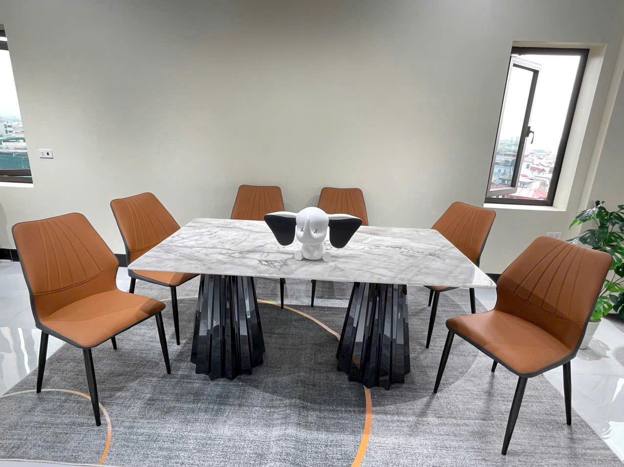 Bộ bàn ăn 6 ghế mang thiết kế hiện đại tối giản, kết hợp mặt đá trắng vân mây với chân bàn gấp khúc màu đen bóng, tạo nên điểm nhấn sang trọng cho mọi không gian bếp. Ghế màu cam cháy nổi bật, đường may gân lưng tinh tế, ôm sát cơ thể, giúp tăng cảm giác thoải mái khi ngồi.