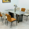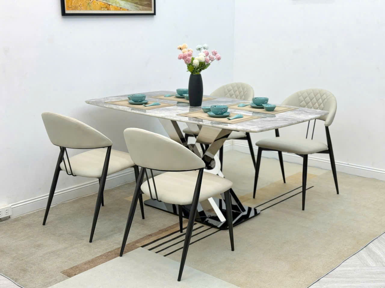 Bàn ăn thiết kế độc đáo với mặt đá vân mây sang trọng, chân bàn đan chéo bằng kim loại sơn tĩnh điện, tạo điểm nhấn nghệ thuật mạnh mẽ. Ghế ăn lưng thấp kiểu dáng hiện đại, màu kem nhẹ nhàng – phù hợp với mọi phong cách nội thất trẻ trung, tối giản.