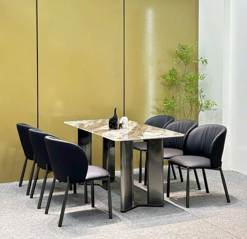 Bộ Bàn Ăn Mặt Đá Vân Nâu – Ghế Lưng Nhún Đen Hiện Đại, Đậm Chất Minimal