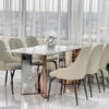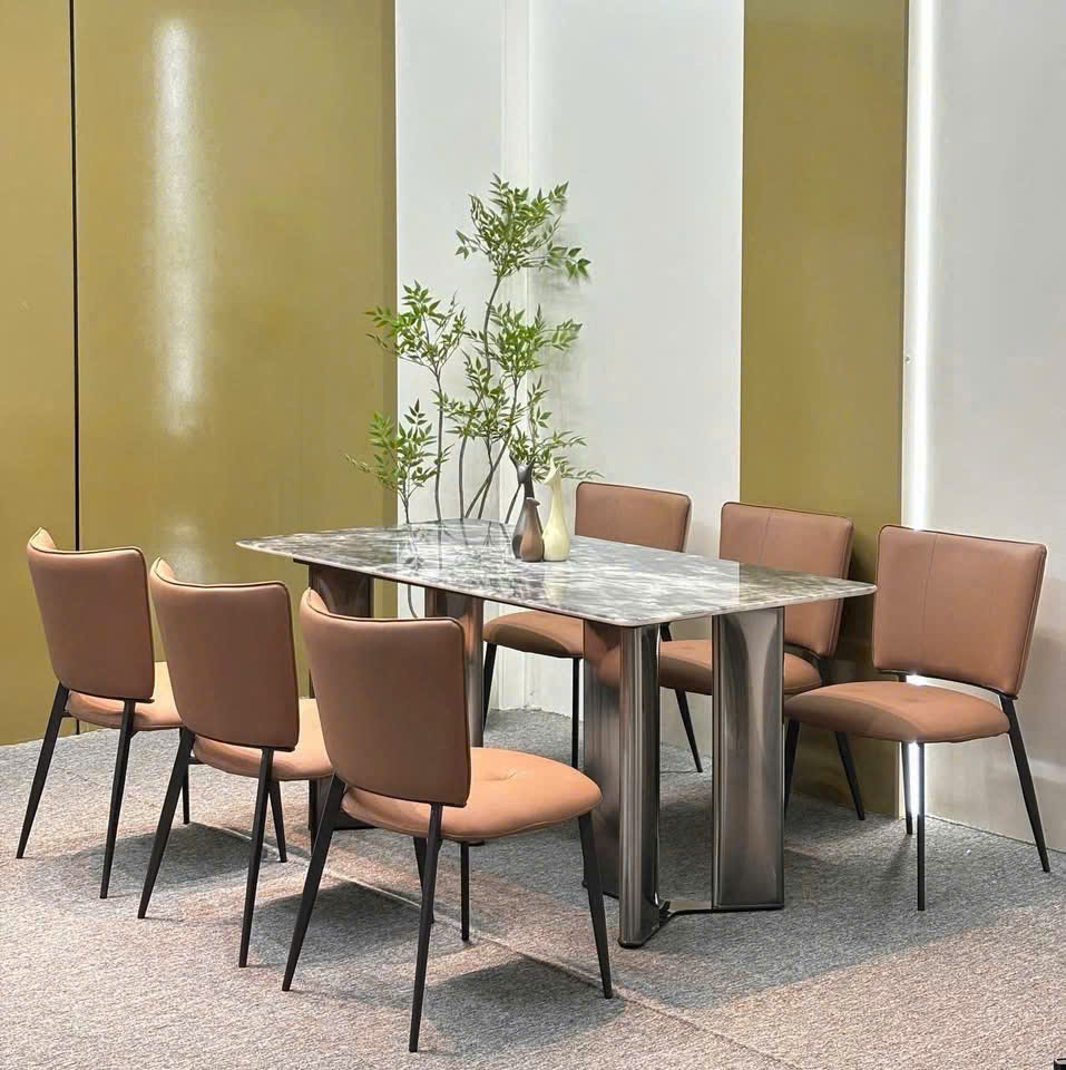 Bàn ăn mặt đá vân mây đen trắng độc đáo, phối chân inox gương sáng bóng tạo hiệu ứng phản chiếu cực thu hút.