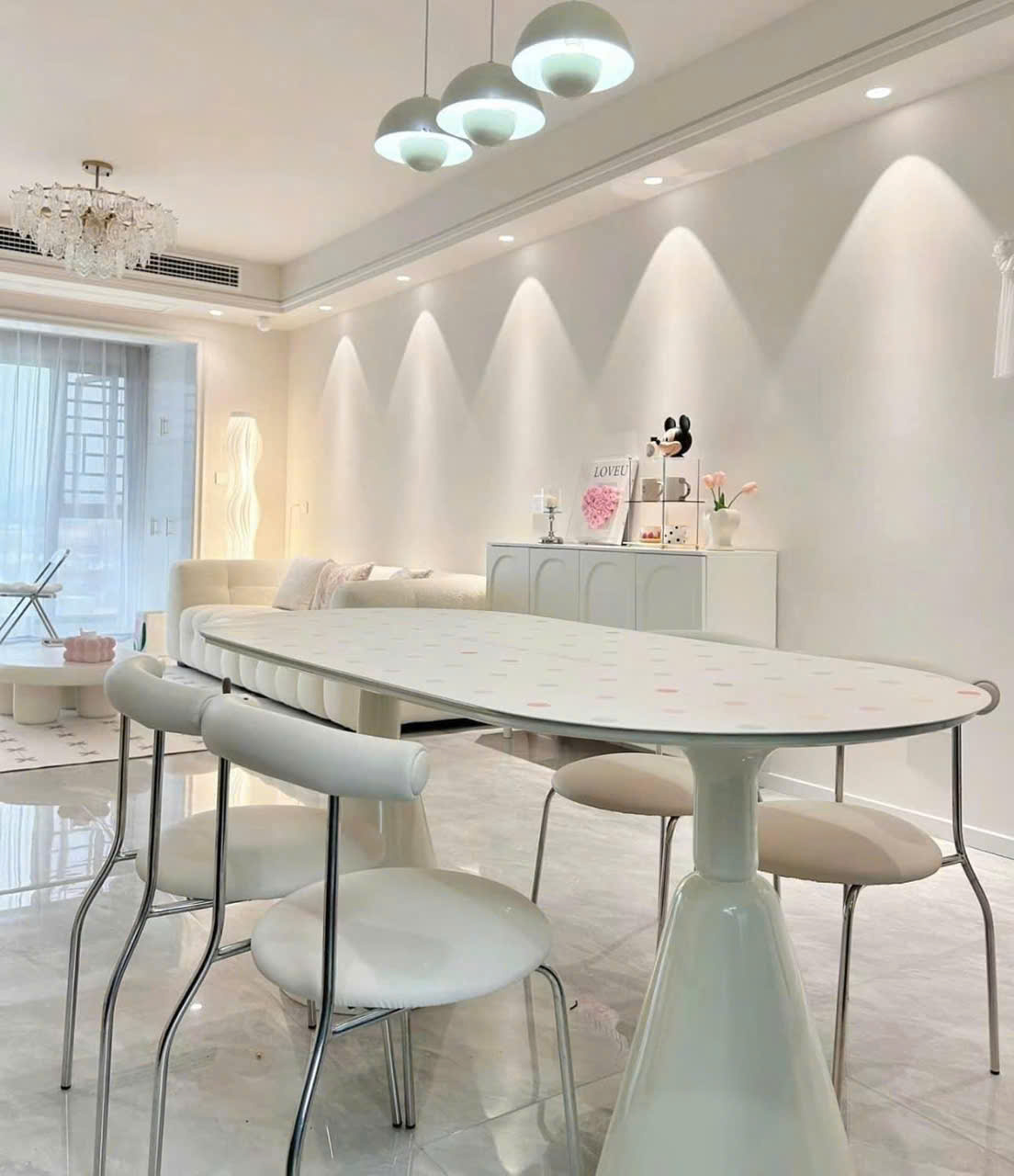 • Gợi ý decor: kết hợp đèn thả, bình hoa, tủ trắng