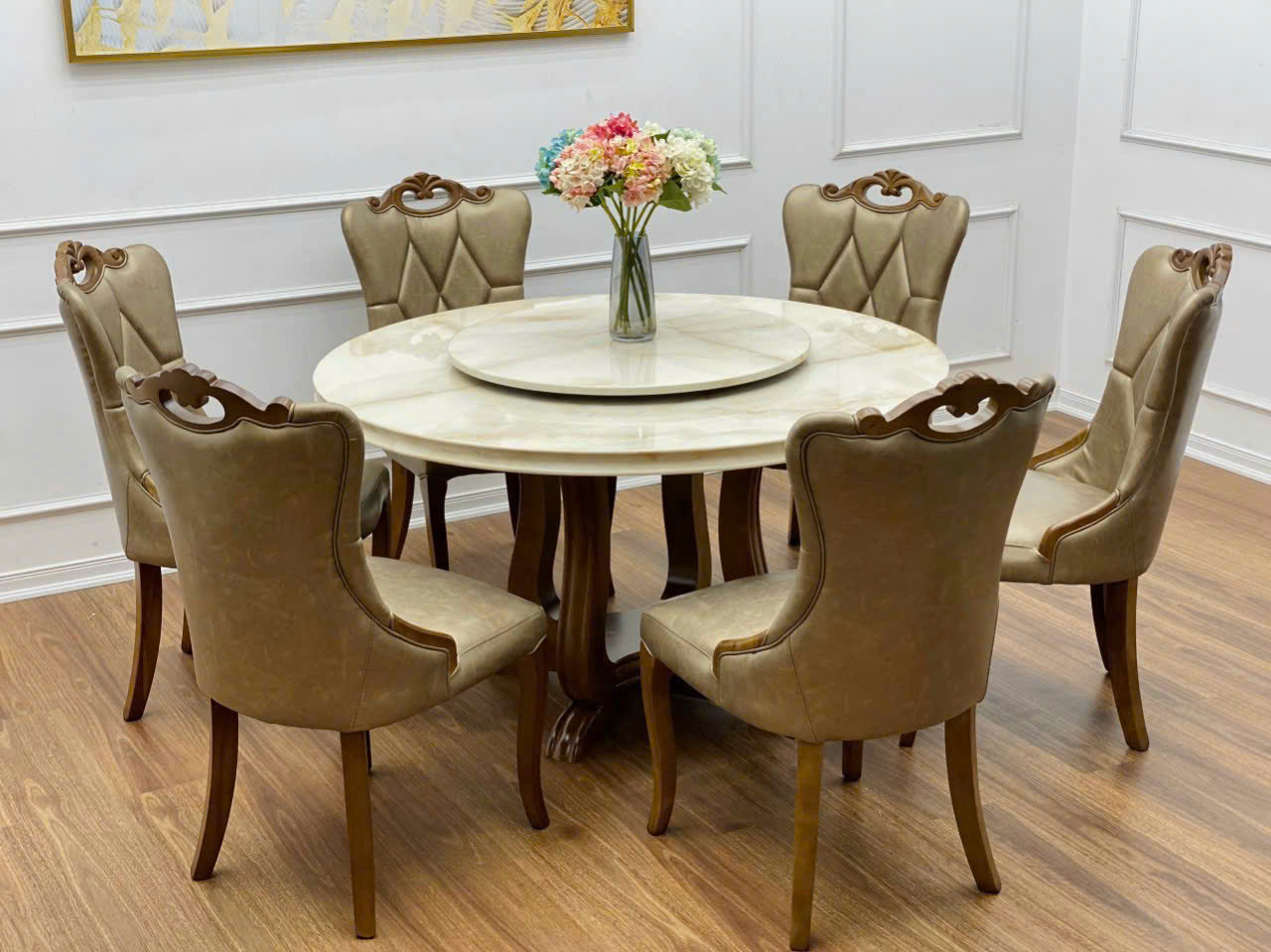 Bộ bàn ăn tròn 6 ghế phong cách tân cổ điển là lựa chọn hoàn hảo cho không gian sống đậm chất quý phái và tiện nghi. Mặt bàn đá trắng vân mây kết hợp mâm xoay tiện lợi, giúp việc dùng bữa thêm tiện nghi, gắn kết. Ghế ngồi được bọc da nâu sáng mềm mại, lưng tựa cao bo tròn phối hoa văn chạm khắc tinh tế – tất cả tạo nên một tổng thể hài hòa, thanh lịch và ấm cúng.