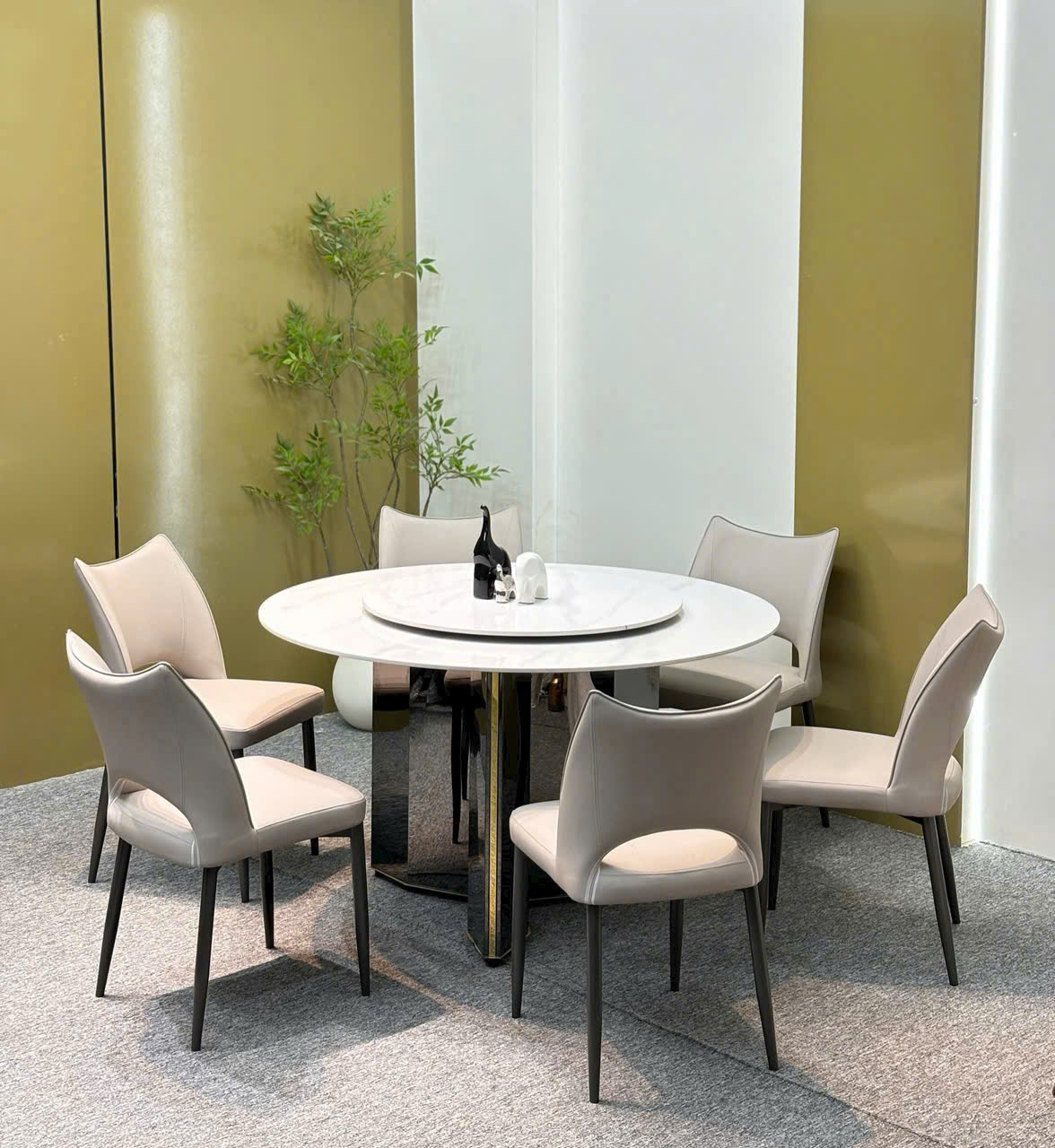 Bộ bàn ăn tròn 6 ghế sở hữu thiết kế hiện đại và tiện ích với mặt đá trắng tinh khôi cùng mâm xoay trung tâm. Chân bàn thép không gỉ mạ bóng tạo cảm giác sang trọng. Ghế ăn bọc da PU màu kem, kiểu dáng cong nhẹ ôm lưng, mang lại sự thoải mái khi sử dụng.