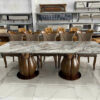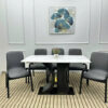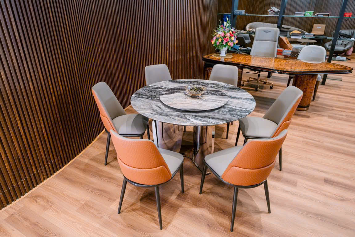 Tạo điểm nhấn ấn tượng cho không gian bếp với bộ bàn ăn tròn mặt đá xoay hiện đại. Thiết kế thông minh với phần mâm xoay tiện dụng, cùng bộ ghế phối màu cam – xám trẻ trung, năng động, bộ bàn ăn này không chỉ tiện nghi mà còn mang tính thẩm mỹ cao, lý tưởng cho gia đình trẻ hoặc không gian sang trọng cần sự phá cách.