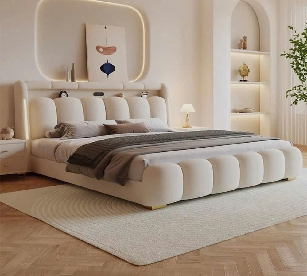 Mang đậm phong cách nội thất Hàn Quốc, mẫu giường ngủ bọc nệm này là sự kết hợp hoàn hảo giữa thiết kế mềm mại, bo tròn an toàn và gam màu kem trung tính, tạo nên không gian nghỉ ngơi nhẹ nhàng, ấm cúng và đầy tinh tế.
