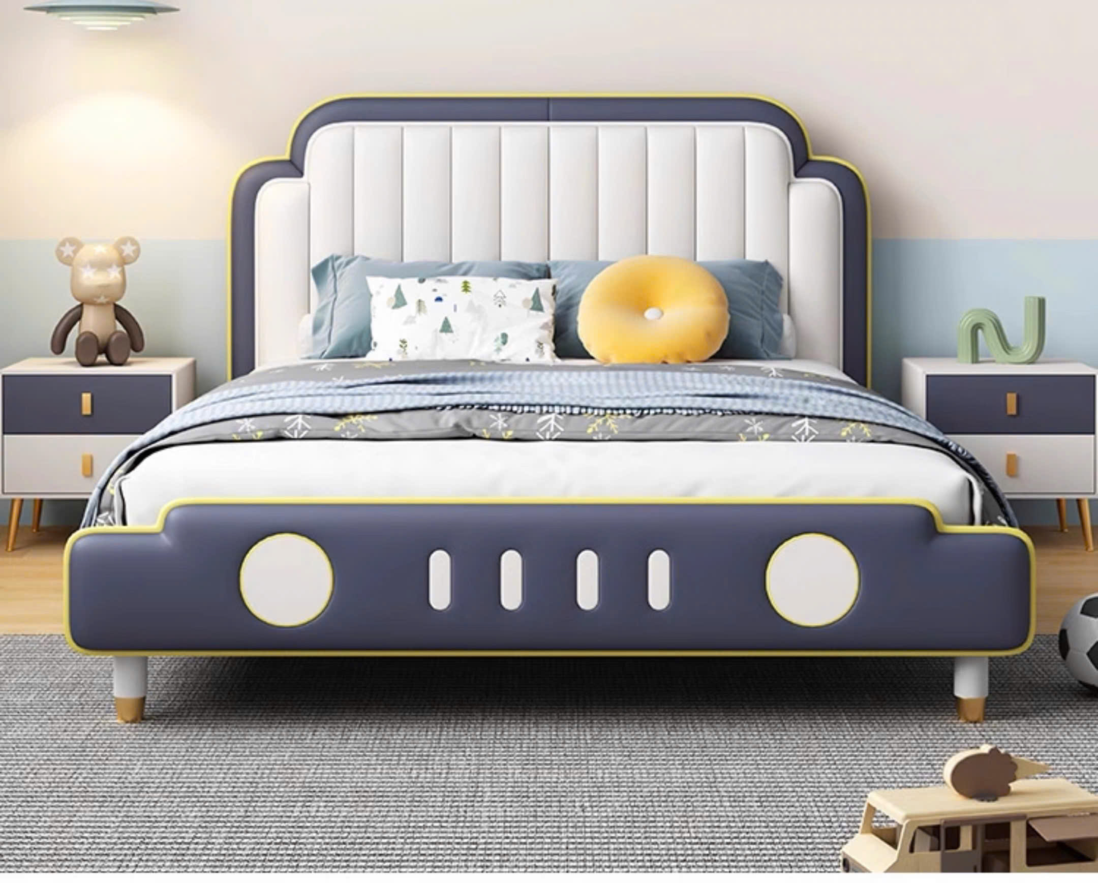 Mang dáng dấp của một chiếc xe hơi cách điệu, giường ngủ trẻ em này là lựa chọn hoàn hảo cho bé trai cá tính, thích khám phá và mê các phương tiện di chuyển. Phối màu xanh navy, trắng và viền vàng neon mang lại cảm giác mạnh mẽ nhưng vẫn rất trẻ trung, dễ thương.