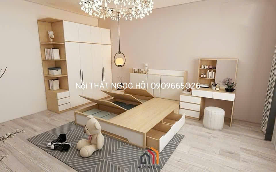 Phòng ngủ gỗ công nghiệp hiện đại tích hợp giường hộp thông minh, tủ quần áo và bàn trang điểm tiện nghi