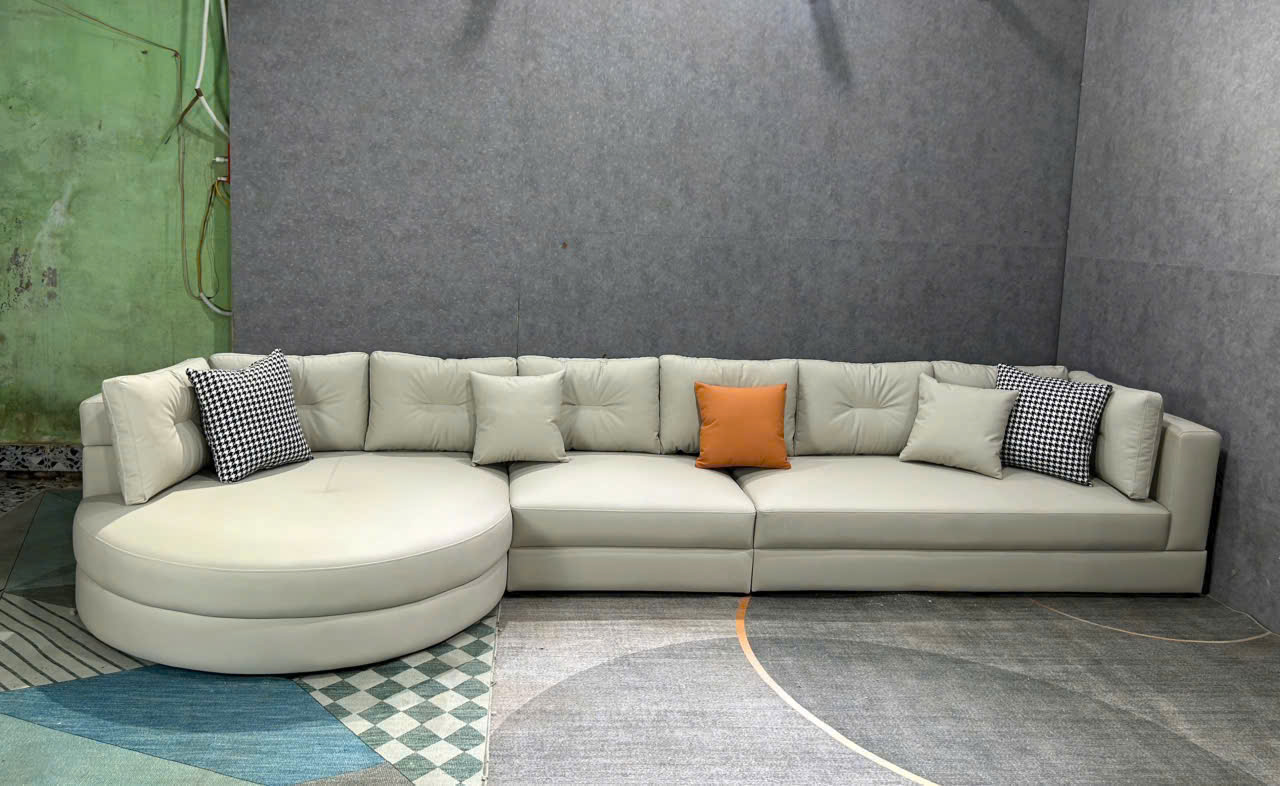 Mang hơi hướng hiện đại kết hợp nét phá cách độc đáo, mẫu sofa góc tựa tròn là lựa chọn lý tưởng cho không gian phòng khách rộng, biệt thự, hoặc showroom cao cấp.