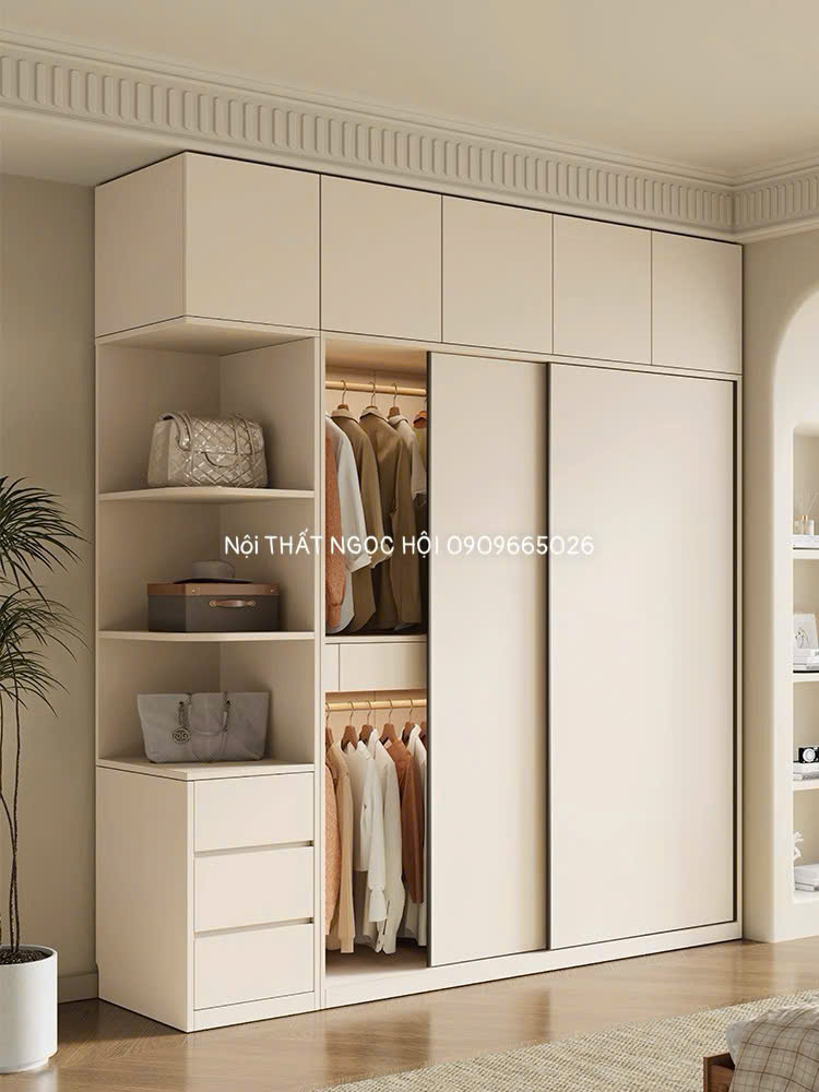 Mẫu tủ quần áo cánh trượt màu kem hiện đại là lựa chọn hoàn hảo cho phòng ngủ có diện tích vừa và nhỏ, giúp tiết kiệm không gian tối đa mà vẫn đảm bảo thẩm mỹ tinh tế. Thiết kế tủ trên cao kết hợp kệ mở bên hông tạo cảm giác nhẹ nhàng, thanh thoát và mang đến không gian lưu trữ rộng rãi, khoa học.