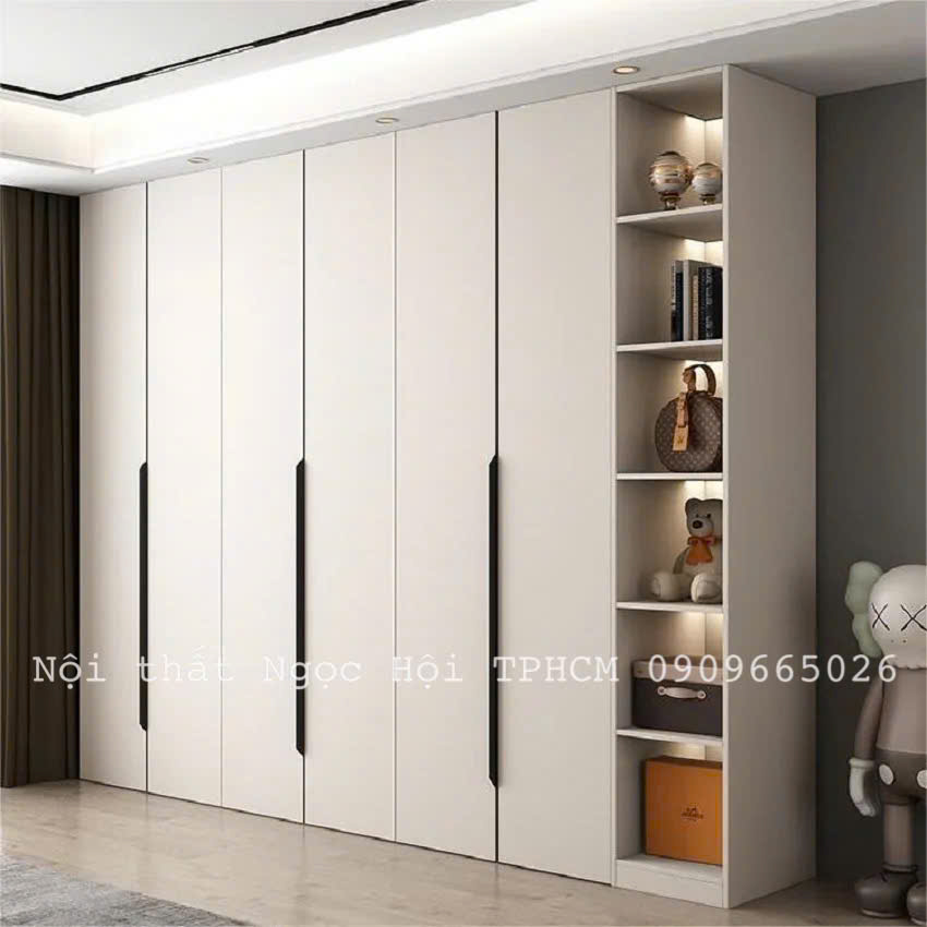 Mẫu tủ quần áo hiện đại với thiết kế cửa mở 5 cánh, tích hợp kệ trang trí bên hông tiện lợi và thẩm mỹ. Sản phẩm phù hợp với các không gian sống mang phong cách tối giản, gọn gàng, sang trọng.