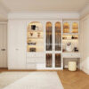 - Phụ kiện tinh tế: Tay nắm kim loại mạ vàng, bản lề êm ái, ghế nhỏ đi kèm.