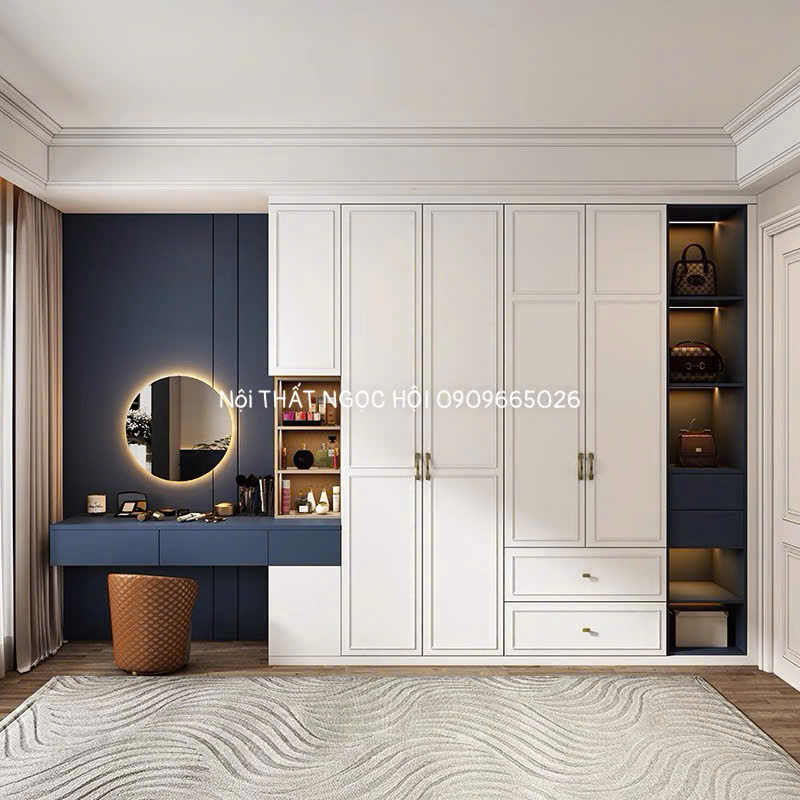 - Thiết kế hiện đại: Kết hợp 6-8 cánh cửa trắng với kệ trang điểm màu xanh navy, tạo điểm nhấn độc đáo.