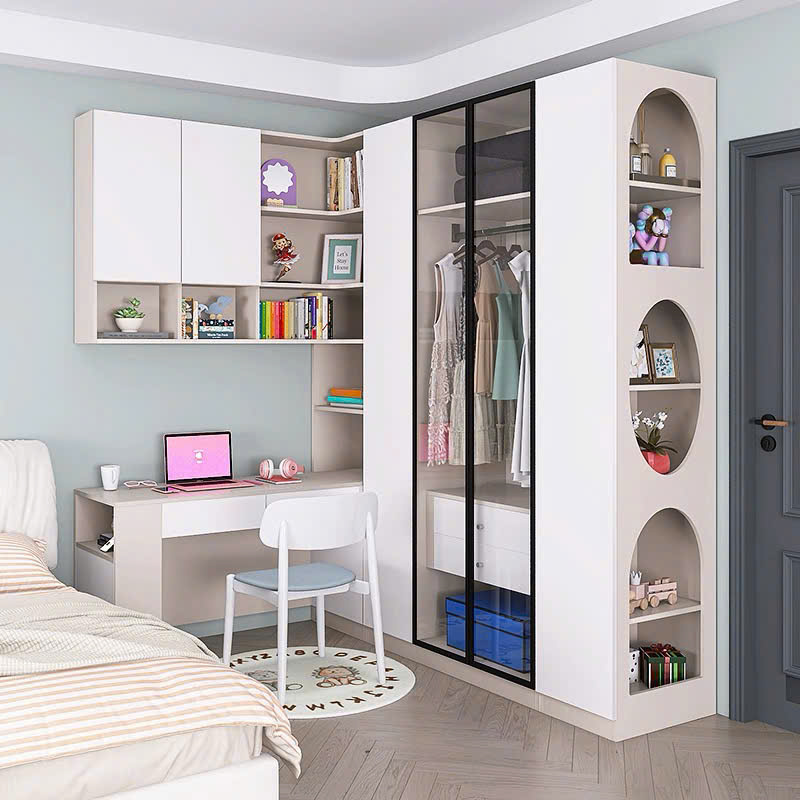 Sản phẩm nổi bật với tông màu trắng thanh lịch, kết hợp điểm nhấn pastel nhẹ nhàng, tạo cảm giác tươi mới. Tủ được thiết kế với ngăn tủ kính trong suốt, cho phép trưng bày quần áo một cách tinh tế. Kệ mở tích hợp đèn LED ấm áp hỗ trợ trưng bày sách vở, đồ chơi hoặc đồ decor. Bàn học đi kèm ghế nhỏ gọn cung cấp không gian học tập tiện lợi, phù hợp với trẻ em.Tích hợp công năng đa năng