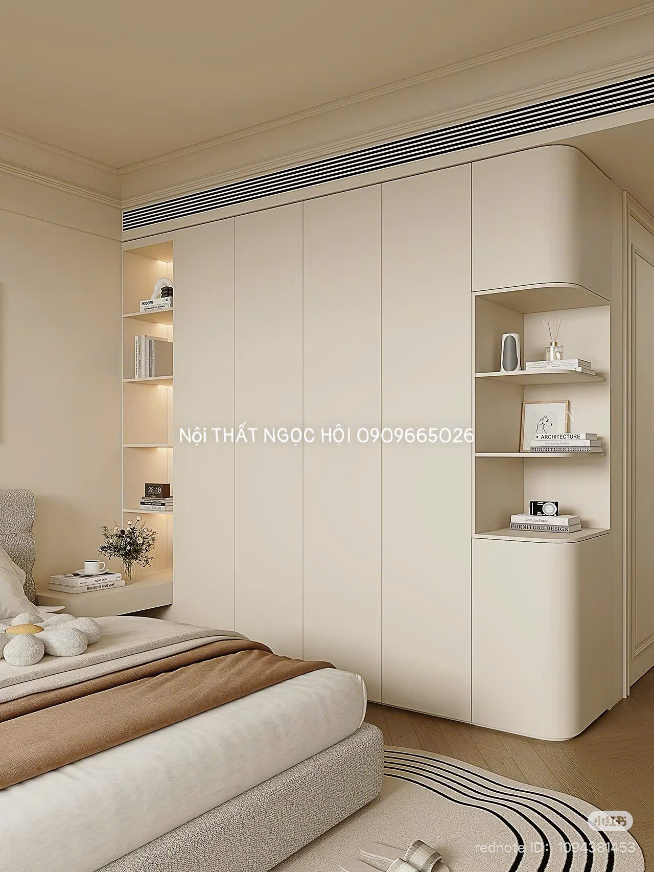 Mẫu tủ quần áo hiện đại màu kem mang phong cách tối giản (minimalist) đang được ưa chuộng trong các căn hộ cao cấp. Thiết kế phẳng không tay nắm, tạo cảm giác liền mạch, sang trọng và giúp không gian phòng ngủ trở nên gọn gàng, thanh thoát hơn.