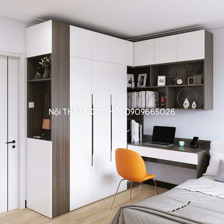 Thiết kế thông minh dạng góc L, tận dụng tối đa diện tích góc tường, giúp không gian trở nên gọn gàng và khoa học. Phần tủ chính gồm các cánh mở lớn kết hợp kệ trang trí mở, thuận tiện cho việc lưu trữ quần áo, túi xách, sách vở hoặc phụ kiện cá nhân. Bên phải là bàn học liền kệ treo tường với nhiều ngăn chứa, tạo khu vực làm việc hoặc học tập thoải mái và tiện dụng.