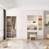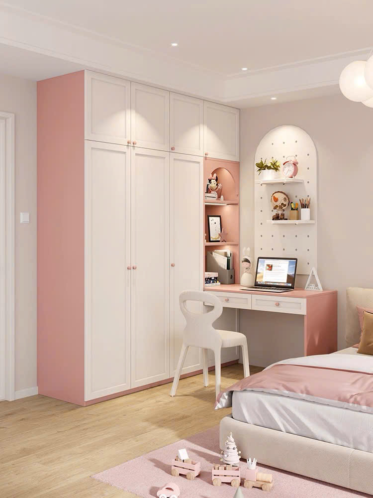 Mẫu tủ quần áo kết hợp bàn học màu hồng pastel mang phong cách hiện đại, dễ thương, giúp không gian phòng bé gái trở nên tươi sáng và gọn gàng hơn.