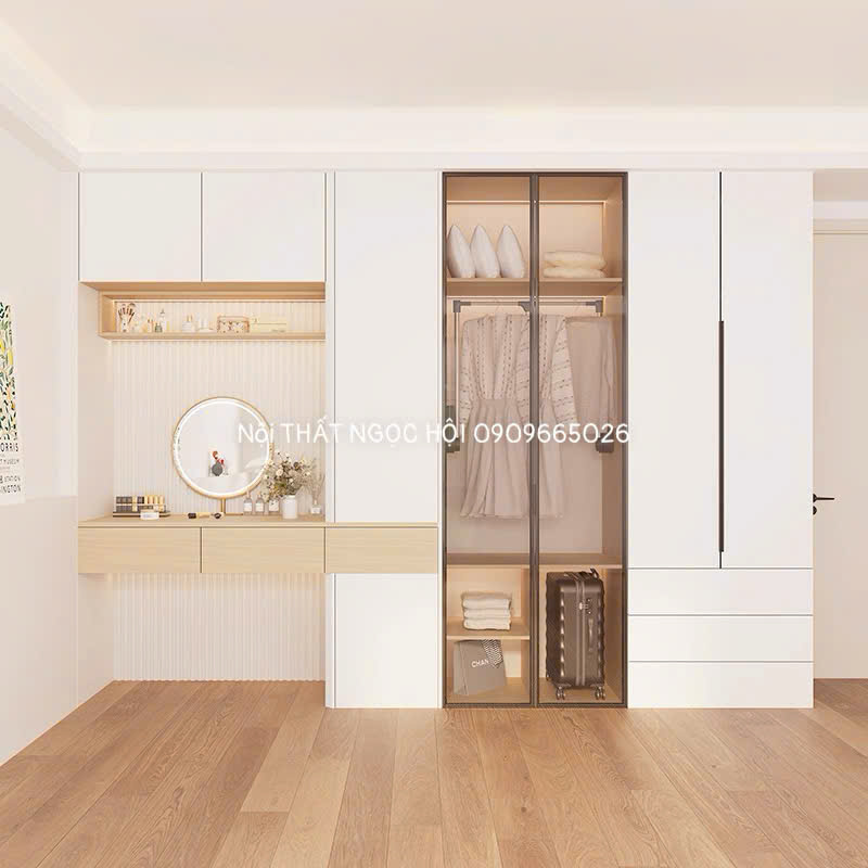 Thiết kế gồm ngăn treo đồ, ngăn chứa vali, kệ trưng bày và tủ trên cao, giúp sắp xếp quần áo, phụ kiện và đồ dùng cá nhân ngăn nắp, khoa học. Bàn trang điểm tích hợp gương tròn đèn LED và hộc kéo rộng, mang đến không gian riêng tiện lợi cho việc làm đẹp và chăm sóc bản thân.