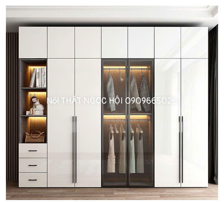 Tủ quần áo kịch trần cánh kính kết hợp cánh MDF trắng bóng