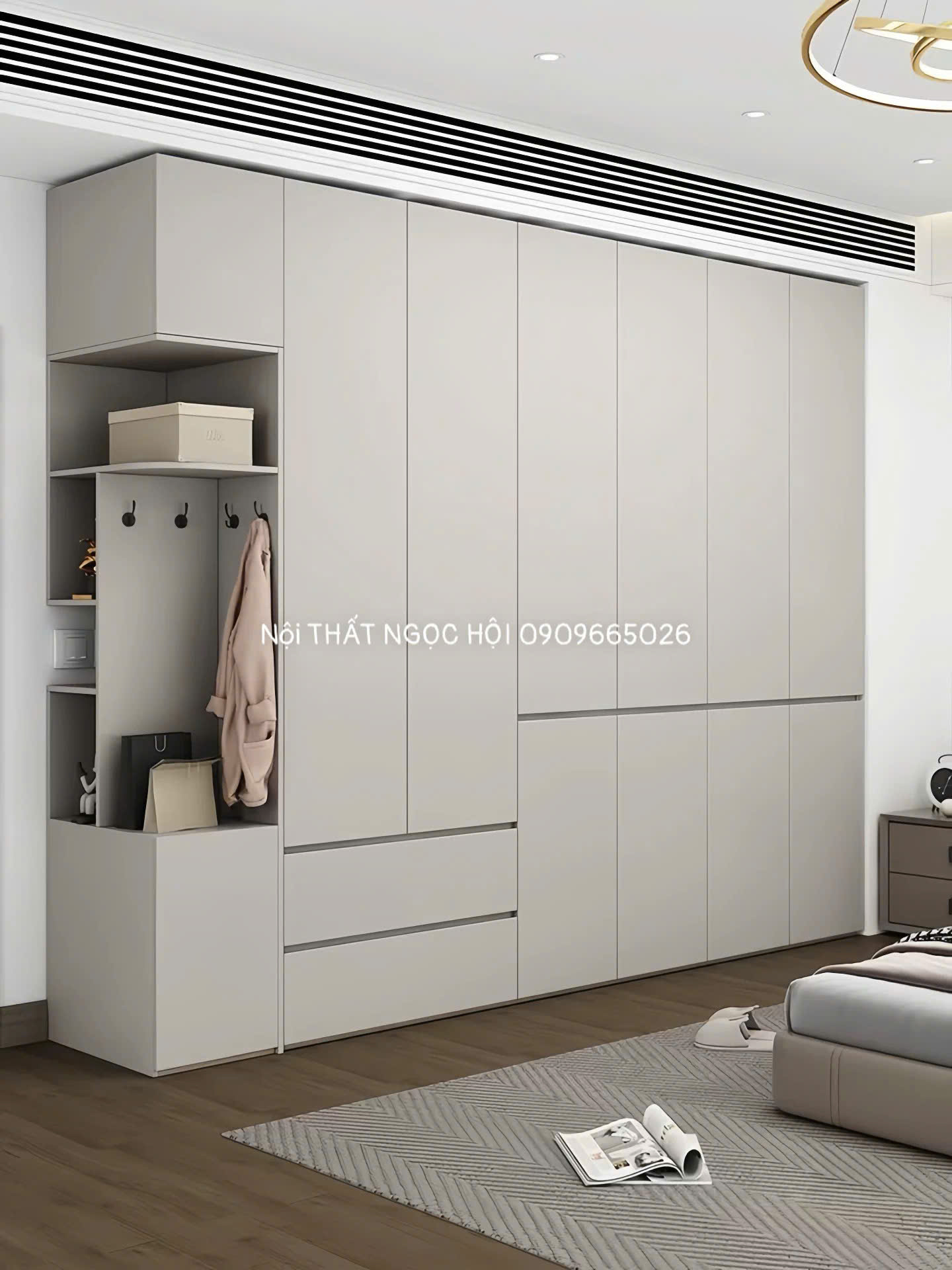 Mẫu tủ quần áo kịch trần phối hộc kéo hiện đại là lựa chọn hoàn hảo cho không gian phòng ngủ cần sự tối giản mà vẫn đảm bảo công năng lưu trữ vượt trội. Thiết kế tủ gồm nhiều cánh mở cao sát trần, kết hợp các ngăn kéo tiện lợi bên dưới và khu vực treo đồ mở kèm móc treo – giúp người dùng dễ dàng sắp xếp quần áo, phụ kiện, túi xách một cách khoa học.