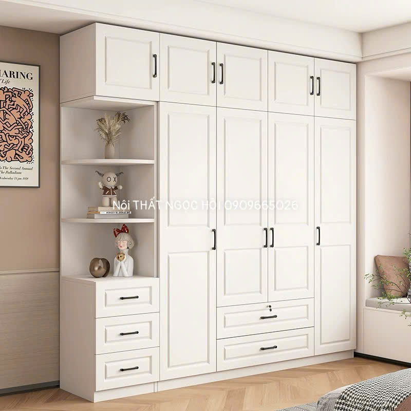 Mẫu tủ quần áo kịch trần màu trắng hiện đại kết hợp kệ trang trí mở là lựa chọn tối ưu cho những phòng ngủ yêu thích sự đơn giản nhưng vẫn sang trọng. Thiết kế nhiều cánh tủ với tay nắm đen nổi bật mang đến vẻ đẹp tinh tế, trẻ trung và dễ phối với mọi phong cách nội thất.