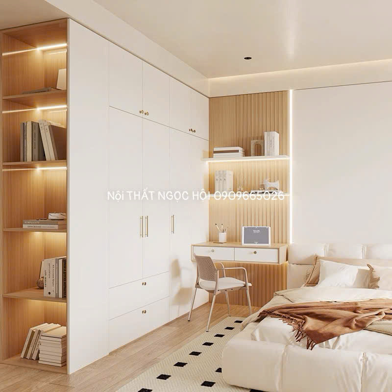 Tủ quần áo liền bàn học và kệ trang trí hiện đại – Nội thất thông minh cho phòng ngủ nhỏ