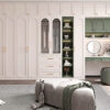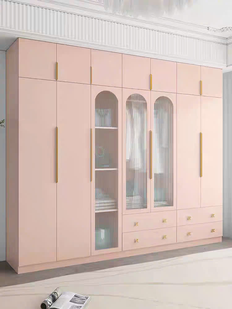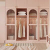 Gam màu hồng pastel thời thượng kết hợp tay nắm dài kim loại mạ vàng ánh sang trọng, mang đến vẻ đẹp nữ tính và hiện đại, phù hợp với nhiều phong cách nội thất – đặc biệt là phòng ngủ của phái nữ, vợ chồng trẻ hoặc căn hộ chung cư cao cấp.