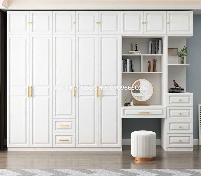 Mẫu tủ quần áo tân cổ điển kịch trần kết hợp bàn trang điểm là lựa chọn hoàn hảo cho không gian phòng ngủ hiện đại yêu thích sự tinh tế và tiện nghi. Thiết kế sang trọng với các đường phào nổi đặc trưng, kết hợp màu trắng thanh lịch giúp không gian như rộng và sáng hơn.