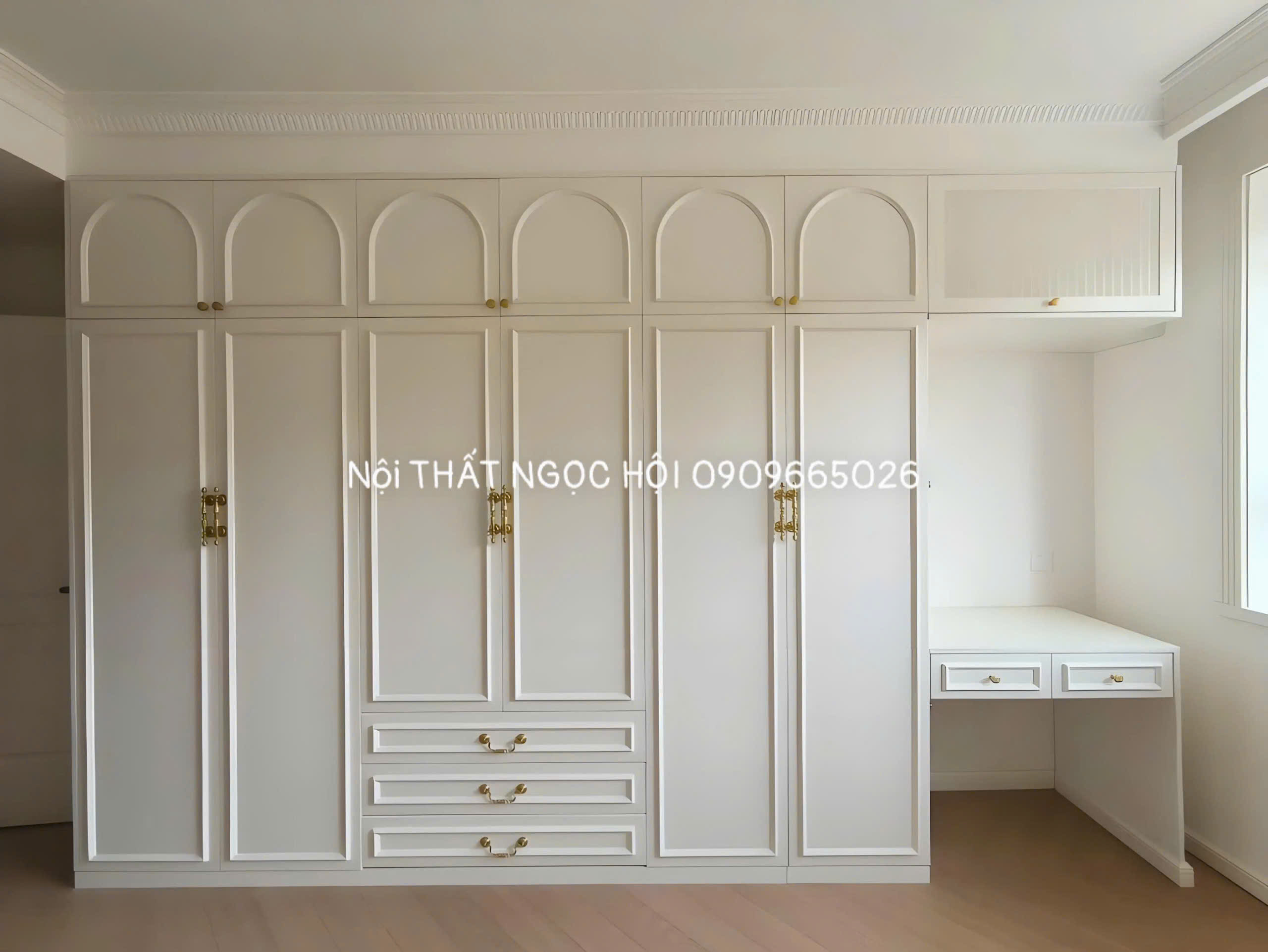Thiết kế gồm 4 cánh tủ lớn kết hợp 3 ngăn kéo tiện dụng, phần trên là hệ tủ kịch trần giúp tối ưu diện tích lưu trữ. Điểm nhấn tinh tế nằm ở hệ vòm cong trang trí tạo nên nét mềm mại đặc trưng của phong cách tân cổ điển.