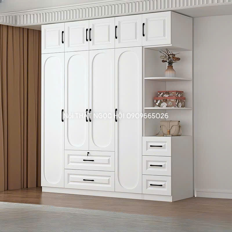 Phần kệ mở bên hông là điểm nhấn tiện dụng, giúp trưng bày phụ kiện, túi xách hoặc đồ trang trí, vừa tạo tính thẩm mỹ vừa tăng công năng. Tay nắm kim loại đen nổi bật trên nền trắng tạo điểm nhấn đối lập tinh tế, làm không gian phòng ngủ trở nên sang trọng và cao cấp hơn.